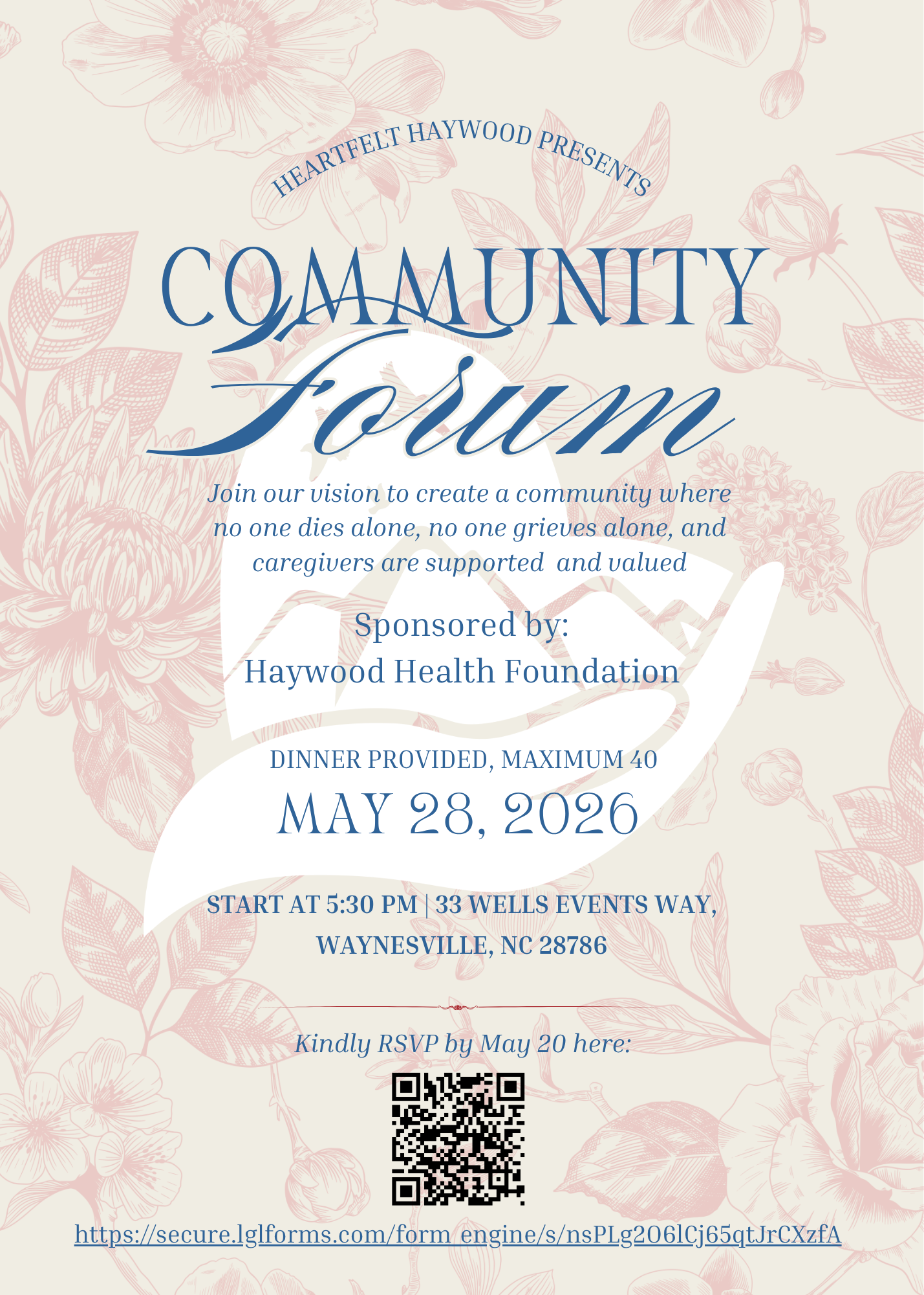 Thursday, May 28, 2026. 5:30-7:00pm, there will be a facilitated dinner conversation with the leadership of Heartfelt Haywood. This Community Forum will focus on the vision for creating a comfortable alternative to dying at home or in a facility. Comfort Homes, a social model for providing end-of-life care, are promoted by the Omega Home Network. These are community-owned spaces where the community organizes to provide care - much as a family would - for those who do not have family caregivers, can’t afford paid caregivers, or are at risk of homelessness at the end-of-life. Team Leaders will provide an overview of the various options we might pursue as a community. Thank you for your dedication to making Haywood County a place where no one dies alone, no one grieves alone, and caregivers are supported and valued!
